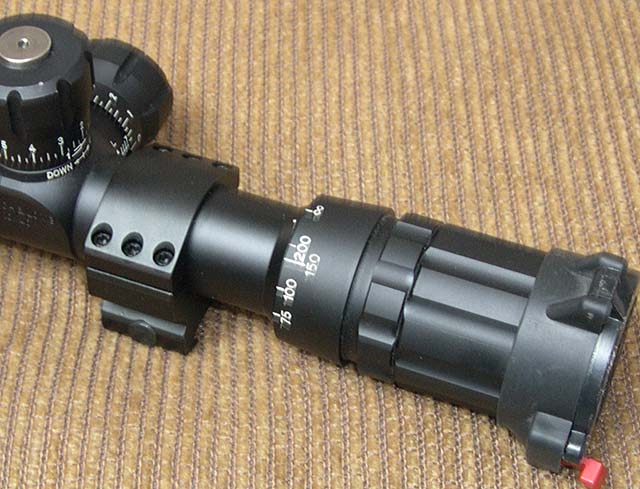 The construction of these scopes is top of the line, the fit and finish are good quality and the scope feels solidly built. The 30mm main tube provides good main tube strength and the knobs themselves are large and appear to be rugged. The knobs found on the new Elite 3200 10x scope offered by Bushnell are very similar in design, though not exactly the same. The knobs on this B&L 10x have 1/4 MOA clicks and there are 12 MOA of adjustment per revolution. The total vertical adjustments are around the 100 MOA mark. The knobs are a great design, I like the size and they have a good click feel that is positive but subdued audibly. The parallax adjust is at the eyepiece, though not as desirable a location as on the side of the tube, it is better than on the bell of the scope. Though I can see potential problems with the parallax adjust being right near the eyepiece focus, it might take some familiarization to get used to which is which and to adjust the parallax and not the eye piece when not looking directly at the two adjustments and attempting to do it by feel.