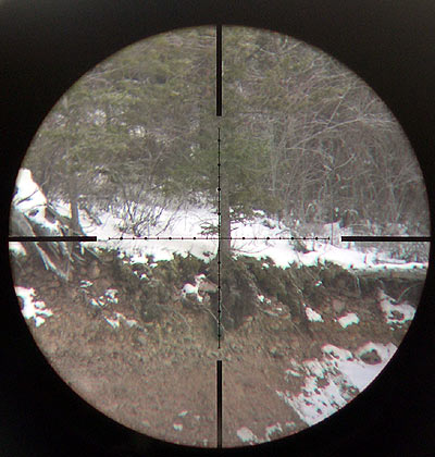 The turrets are of a good size and shape, similar to Leupold M1 knobs and are 1/8 MOA per click. The 1/8 is certainly accurate and allows for very precise adjustments, but on a tactical scope where many scope changes are used, I prefer 1/4 MOA clicks to help prevent having to dial twice as many clicks for adjustments. But that being said, the 1/8th clicks are precise and these knobs are nice. There is 9 MOA per revolution and while the spec sheet says there are 65 MOA of adjustment, this one actually had 109 MOA of vertical adjustments. I have heard 100 MOA from millett directly, and that is what I would plan on having if you were purchasing one of these scopes. The windage knob is marked starting at 1 going each direction, which is a feature I really like on tactical scopes. But, on this particular scope with the 1/8 MOA clicks and only 9 MOA per revolution, at 4.5 MOA you now are overlapping on the numbers. So if you were at 6 MOA right, the knob would read 3. It is not a horrible deal, but some confusion can happen, and it is the same argument for all scopes with knobs marked like this, but on this scope, it happens at only 5 MOA. The other thing I did not like about the knobs is that there is no visual reference for how many times the elevation knob has rotated around zero. Most other makers with external knobs provide horizontal lines on the elevation knob that can be used as a reference for how many times the knob has rotated past zero. The other interesting feature with the knobs on this scope is the lock rings on both the elevation and windage knobs. The lock ring is knurled also and is located at the bottom of each knob. A slight turn clockwise locks each knob so they will not move. They work as designed and are easy to operate, and there are times where an inadvertent knob turning does happen in the field. I'm not sure how important the feature really is, but it does work and is something other makers do not offer. Side focus knobs are a popular trend of tactical scopes, as they should be, allowing for precise adjusting of the objective within easy reach while behind the scope. The TRS-1 has a large diameter knob that is marked from 10yds to infinity. The focus works as it should, but there was a problem with how stiff the knob is to adjust. I do not know if it was just this particular scope, or if all of them are like this, but the focus knob is very stiff and hard to adjust. Once applying enough force to twist it, it is smooth, but still requires significant force to keep moving it. I thought it may loosen up, but it has not yet. It is not a two finger twist, but requires ham fisting it. It works and focuses as it should, it is just very stiff to twist. The reticule is a unique mildot design that is intuitive. There are half mil tick marks to aid in accurate mil readings, and there are dots at the whole mil marks. The dots are very small compared to normal mildot reticules. The USMC mildot is .25 mils, and the US Army mil-dot is .22 (or .2 if you round like the US Army teaches) but these dots are even smaller. The mil sheet provided says they are 1/4 MOA dots, which translates to about .07 mils, or 1/3 the size of a US Army mildot. They don't look quite that small, but I may be mistaken, or perhaps the documentation is incorrect, but they are small. Small dots are fine, just different, and they do not obscure much of the target. The reticule is nicely etched onto the glass for durability. The reticule is on the second focal plane which means it stays the same size no matter what magnification you are on, so for the mildots to be accurate, you have to be on the designated magnification, which for this scope is 16x. The reticule is lighted green with 10 different power settings. I did notice if it was fairly dark like at late dusk and the reticule setting was on the higher settings (above about 8) there was some excess light entering the tube from the lighting component from both the 7 o'clock and 2 o'clock position in the scope. You only really see it if there is not much light out, but it does indicate perhaps the quality of the eye piece housing containing the lighted reticule could use some improvement.